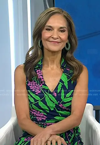 Joy Bauer on Today on NBC was spotted wearing this floral sleeveless wrap dress on Today on Aug 27 2025's episode. Joy's Dress is the Floral Silk Dress in Green by Flora Bea NYC.