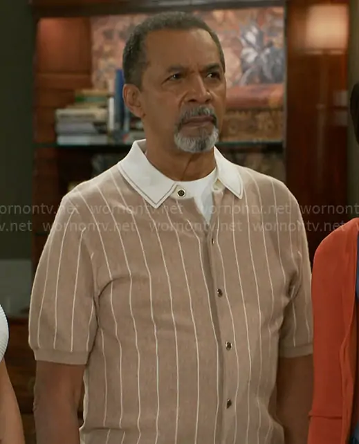 Vernon Dupree (played by Clifton Davis) on Beyond the Gates on CBS was spotted wearing this beige striped shirt on Beyond the Gates on Aug 28 2025's episode. 's Shirt is the Worthy Stripe Short Sleeve Wool Button-Up Shirt in Camel by Reiss.