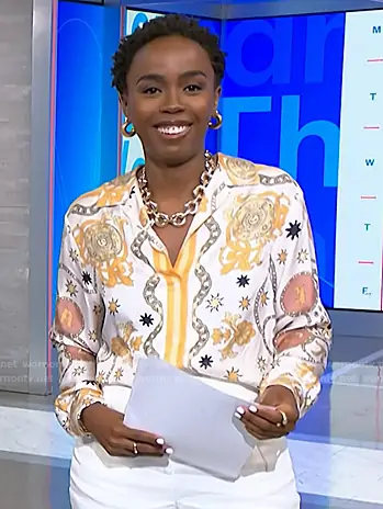 Zinhle Essamuah on NBC News Daily on NBC was spotted wearing this Zinhle’s white print Blouse on NBC News Daily on Aug 28 2025's episode. Zinhle's Top is the Gina Silk Scarf Print Blouse by Sandro.