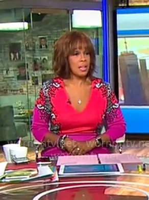 Gayle King on CBS Mornings on CBS was spotted wearing this pink and red printed v-neck dress on CBS Mornings on Mar 07 2018's episode. Gayle's Dress is the Tikka Dress by St John .