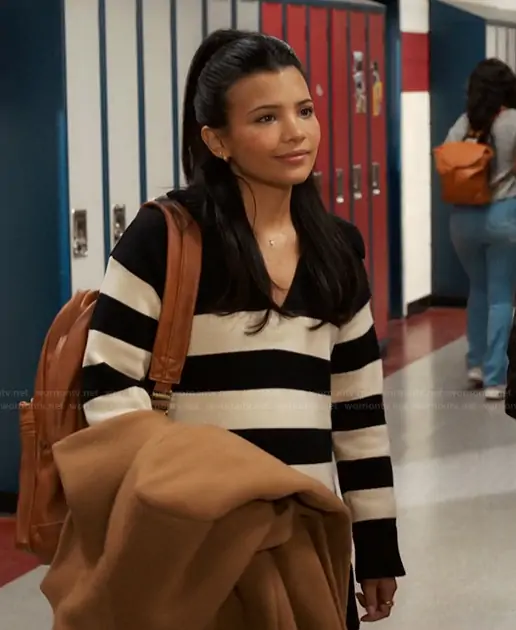 Jackie Howard (played by Nikki Rodriguez) on My Life with the Walter Boys on Netflix was spotted wearing this striped pleated dress on My Life with the Walter Boys on episode 'Showdowns and Sparkles' (2x10) in Sep 2025. Jackie's Dress is the Mixed Media Stripe Pleated Mini Dress by English Factory.