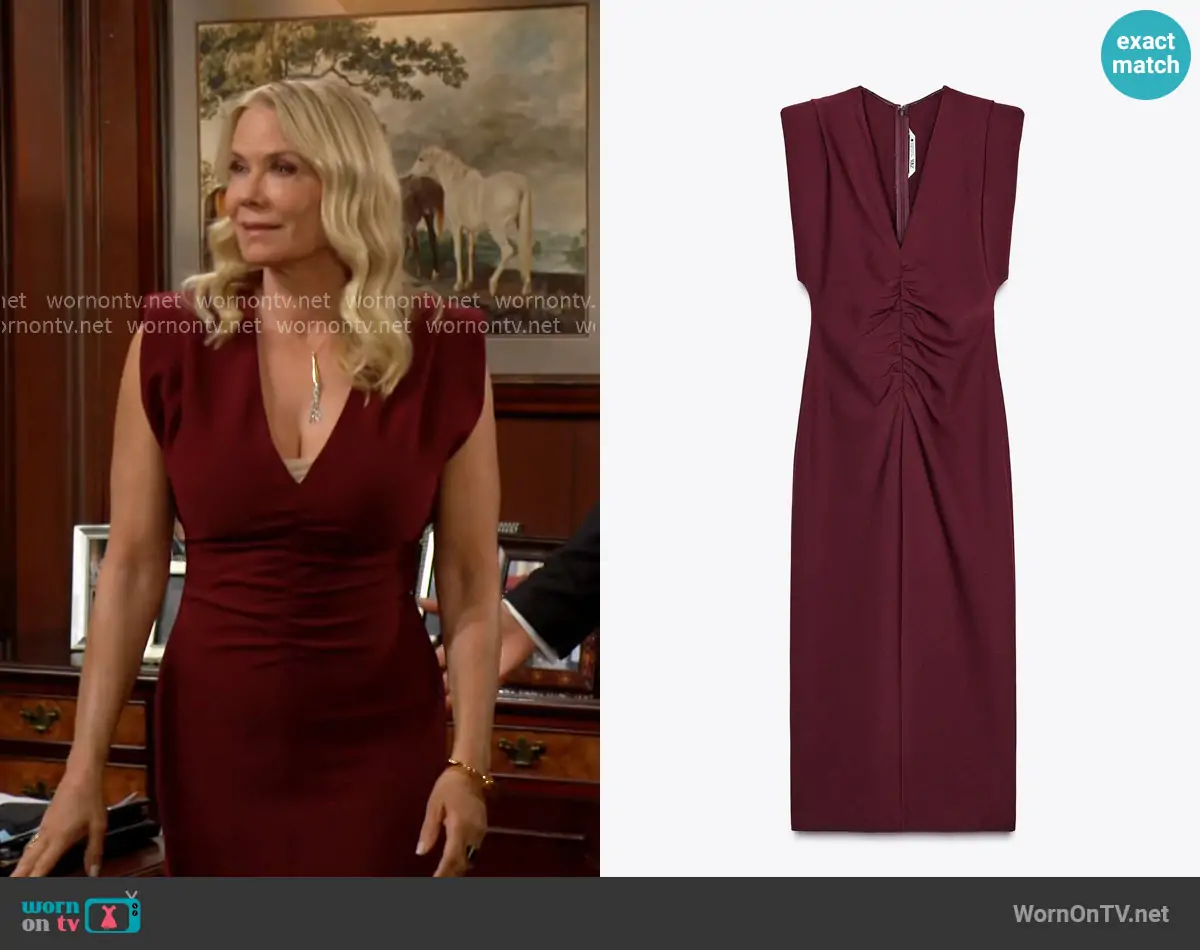 Brooke Logan (played by Katherine Kelly Lang) on The Bold and the Beautiful on CBS was spotted wearing this burgundy v-neck ruched front dress on The Bold and the Beautiful on Sep 02 2025's episode. Brooke's Dress is the Draped Midi Dress by Zara.