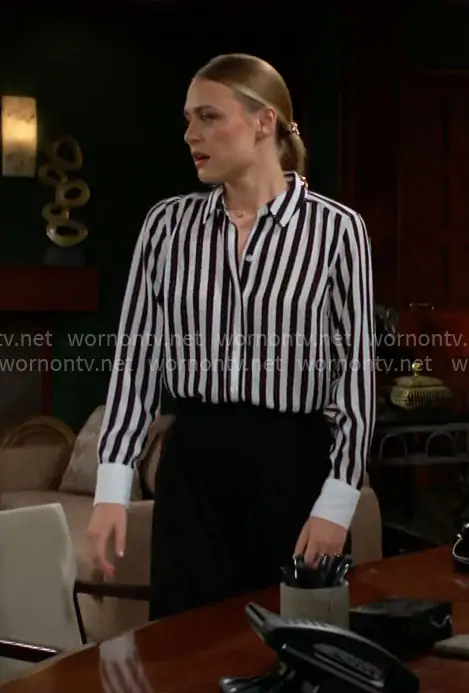 Claire Grace (played by Hayley Erin) on The Young and the Restless on CBS was spotted wearing this striped button down shirt on The Young and the Restless on Sep 05 2025's episode. Claire's Top is the Striped Contrast-Cuff Shirt by INC International Concepts.