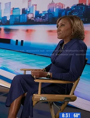 Robin Roberts on Good Morning America on ABC was spotted wearing this navy wrap shirtdress on Good Morning America on Sep 15 2025's episode. Robin's Dress is the Sana Dress in Classic Navy by Diane von Furstenberg.