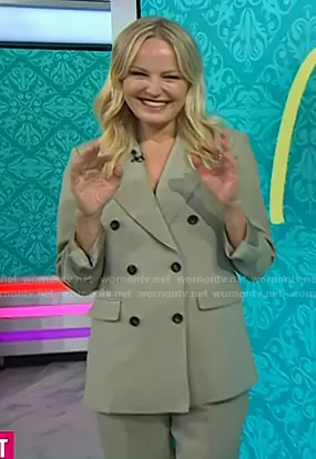 on Today on NBC was spotted wearing this sage green suit on Today on Sep 08 2025's episode. 's Jacket is the Double Breasted Lapel Blazer in Laurel Oak by Lily Silk . 's Pants is the Silk-Wool Twill Flare Pants in Laurel Oak by Lily Silk.