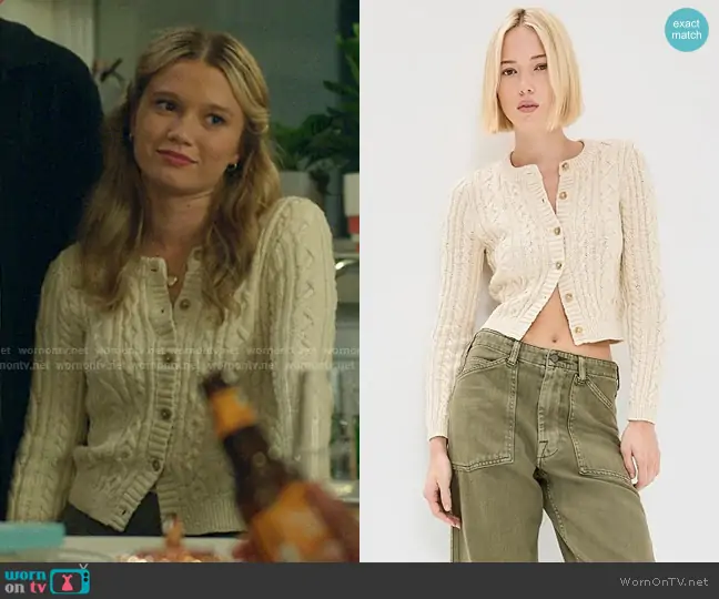 Taylor Jewel (played by Rain Spencer) on The Summer I Turned Pretty on Amazon Prime was spotted wearing this whtie cable knit cardigan on The Summer I Turned Pretty on episode 'Last Year' (3x10) in Sep 2025. Taylor's Sweater is the Cable Shrunken Cardigan in Ecru Slub by Denimist.