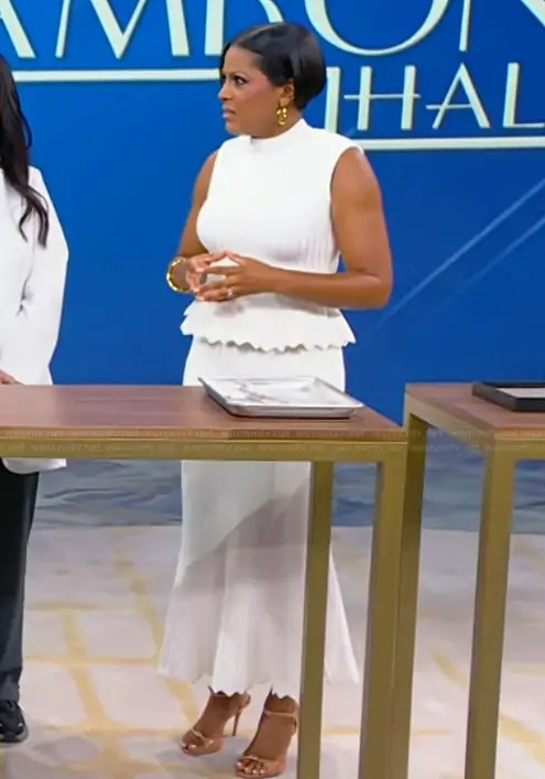 Tamron Hall on Tamron Hall Show on ABC was spotted wearing this white peplum top and skirt on Tamron Hall Show on Sep 10 2025's episode. Tamron's Top is the Naja Cotton Knit Top by Aknvas . Tamron's Skirt is the Mie Cotton Knit Skirt by Aknvas . Tamron's Shoes is the Adut crystal-embellished buckled patent-leather sandals by Amina Muaddi.