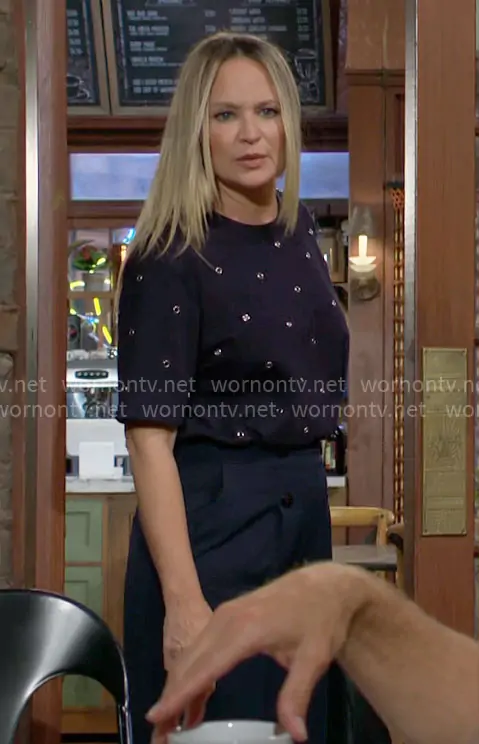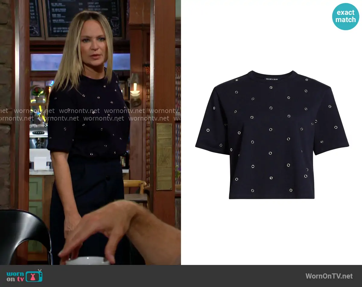 Sharon Newman (played by Sharon Case) on The Young and the Restless on CBS was spotted wearing this navy grommet stud top on The Young and the Restless on Sep 10 2025's episode. Sharon's Top is the Sebastian Studded Cotton Top by Veronica Beard.