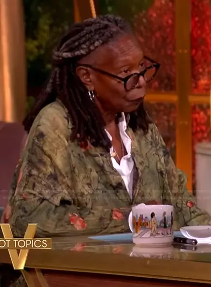 Whoopi Goldberg on The View on ABC was spotted wearing this green floral print shirtdress on The View on Sep 11 2025's episode. Whoopi's Robe is the Jumbo Long Sleeve Shirtdress by R13.
