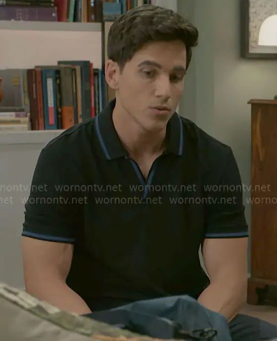 Bradley 'Smitty' Smith (played by Mike Manning) on Beyond the Gates on CBS was spotted wearing this black polo shirt with blue trims on Beyond the Gates on Sep 10 2025's episode. Smitty's Shirt is the Johnny Collar Polo by Express.