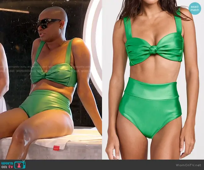 Guerdy Abraira (played by Guerdy Abraira) on The Real Housewives of Miami on Peacock was spotted wearing this green bikini on The Real Housewives of Miami on episode 'Birthday Blues Cruise' (7x15) in Sep 2025. Guerdy's Bikini Top is the Hayden Bikini Top in Emerald Shimmer by Montce . Guerdy's Bikini Bottoms is the High Rise Bikini Bottoms in Emerald Shimmer by Montce . Guerdy's Sunglasses is the Fendi Roma 50mm Square Sunglasses by Fendi.