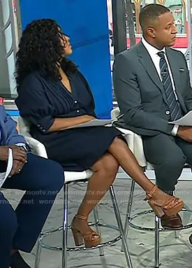 Sheinelle Jones on Today on NBC was spotted wearing this brown platform sandals on Today on Sep 13 2025's episode. Sheinelle's Shoes is the Kareena Woven Platform in Brown by Schutz.
