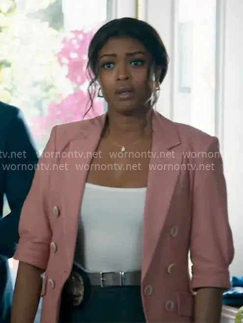 Daphne (played by Javicia Leslie) on High Potential on Hulu was spotted wearing this pink blazer on High Potential on episode 'Pawns' (2x01) in Sep 2025. Daphne's Jacket is the Odile Dickey Jacket by Veronica Beard.