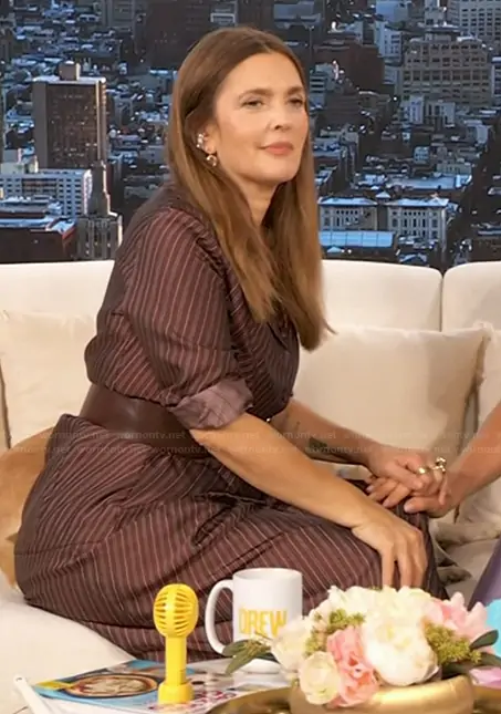 Drew Barrymore on The Drew Barrymore Show on CBS was spotted wearing this burgundy striped top and pants on The Drew Barrymore Show on Sep 15 2025's episode. Drew's Top is the Diagonal Stripe Tailored Button-Up Shirt by Dries Van Noten . Drew's Pants is the Pamplona Striped Pleated Wide-Leg Pants by Dries Van Noten.