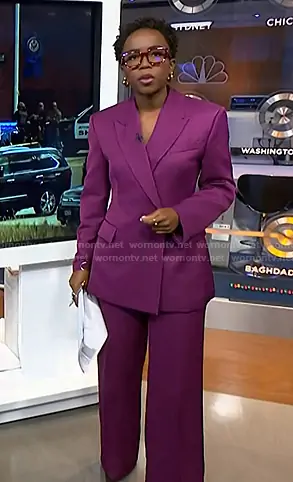 Zinhle Essamuah on NBC News Daily on NBC was spotted wearing this purple blazer and pants on NBC News Daily on Sep 24 2025's episode. Zinhle's Jacket is the Linen-blend Double-breasted Suit Blazer in Fuchsia by Mango . Zinhle's Pants is the Straight-fit Linen-blend Suit Pants in Fuchsia by Mango.