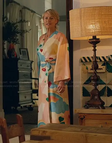 Laura Sanderson (played by Robin Wright) on The Girlfriend on Amazon Prime was spotted wearing this pink printed robe on The Girlfriend on episode 'Episode 2' (1x02) in Sep 2025. Laura's Robe is the Royaume Printed Silk Twill Maxi Robe by Eres.