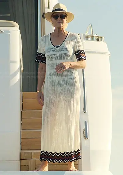 Laura Sanderson (played by Robin Wright) on The Girlfriend on Amazon Prime was spotted wearing this white stripe trim dress on The Girlfriend on episode 'Episode 2' (1x02) in Sep 2025. Laura's Dress is the Luna striped crocheted cotton-blend dress by Eres.