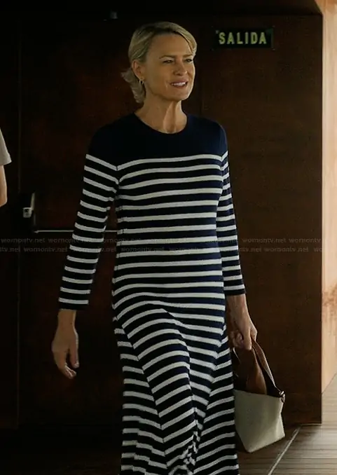 Laura Sanderson (played by Robin Wright) on The Girlfriend on Amazon Prime was spotted wearing this blue striped maxi dress on The Girlfriend on episode 'Episode 2' (1x02) in Sep 2025. Laura's Dress is the Striped Long Dress by Ralph Lauren.
