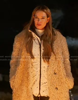 Britani Bateman on The Real Housewives of Salt Lake City on Bravo was spotted wearing this beige shearling coat on The Real Housewives of Salt Lake City on episode 'Hot Dogs and Hearsay' (6x01) in Sep 2025. Britani's Coat is the Faux Fur Collarless Long Coat in Honey-brown by Topshop.