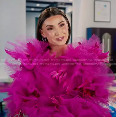 Bronwyn Newport on The Real Housewives of Salt Lake City on Bravo was spotted wearing this fuchsia pleated confessional dress on The Real Housewives of Salt Lake City on episode 'Hot Dogs and Hearsay' (6x01) in Sep 2025. Bronwyn's Dress is the custom made by Costume Designer Christian Siriano.