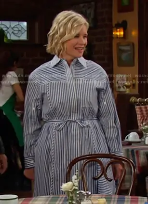 Kayla Brady (played by Mary Beth Evans) on Days of our Lives on Peacock was spotted wearing this blue striped shirtdress on Days of our Lives on Sep 18 2025's episode. Kayla's Dress is the Stripe Tie Waist Shirtdress in Blue by 3.1 Phillip Lim.