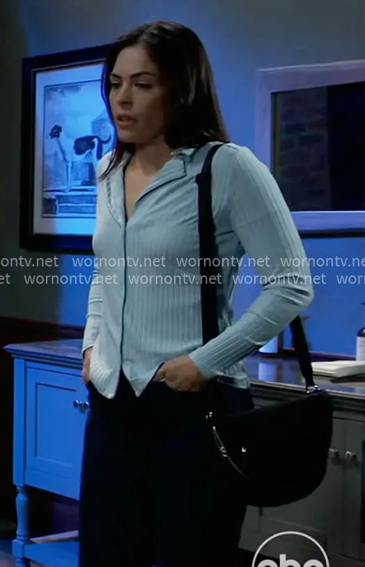 Britt Westbourne (played by Kelly Thiebaud) on General Hospital on ABC was spotted wearing this sky blue ribbed button down top on General Hospital on Apr 17 2026's episode. Britt's Top is the Sur Ribbed Resort Shirt by Banana Republic .