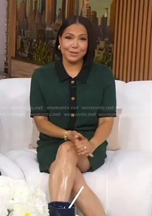 Stephanie Ramos on Good Morning America on ABC was spotted wearing this Stephanie’s green contrast trim cardigan and mini skirt on Good Morning America on Sep 18 2025's episode. Stephanie's Sweater is the Marie Cardigan in Pine/Black by Veronica Beard . Stephanie's Skirt is the Rivka Mini Skirt in Pine/Black by Veronica Beard.