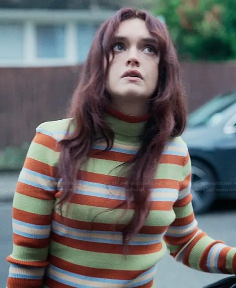 Cherry Laine (played by Olivia Cooke) on The Girlfriend on Amazon Prime was spotted wearing this stripe turtleneck top on The Girlfriend on episode 'Episode 4' (1x04) in Sep 2025. Cherry's Sweater is the Daisy Street ribbed knit roll neck jumper in multi stripe by ASOS.