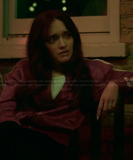 Cherry Laine (played by Olivia Cooke) on The Girlfriend on Amazon Prime was spotted wearing this pink sleeve stripe jacket on The Girlfriend on episode 'Episode 4' (1x04) in Sep 2025. Cherry's Jacket is the Striped Zipped Bomber Jacket Palm Angels.