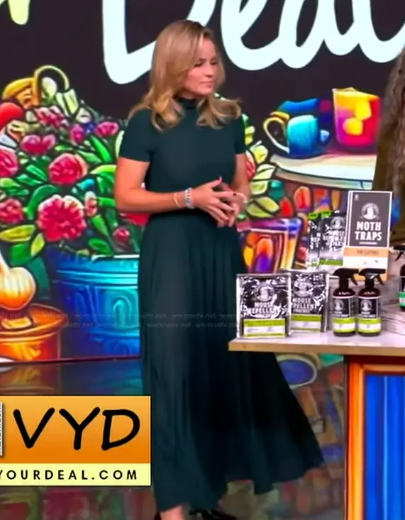Sara Haines on The View on ABC was spotted wearing this teal top and skirt on The View on Sep 19 2025's episode. Sara's Bodysuit is the Tommy Mock Turtleneck Bodysuit by Ronny Kobo . Sara's Skirt is the Mist Skirt by Ronny Kobo.