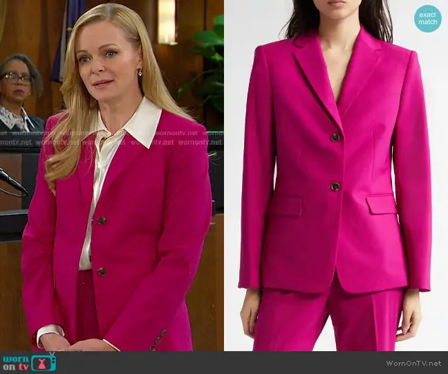 Belle Brady (played by Martha Madison) on Days of our Lives on Peacock was spotted wearing this pink suit on Days of our Lives on Sep 15 2025's episode. Belle's Jacket is the Slim-Fit Wool Blazer in Wildflower by Theory . Belle's Pants is the Stretch Wool Straight Full-Length Trousers in Wildflower by Theory.