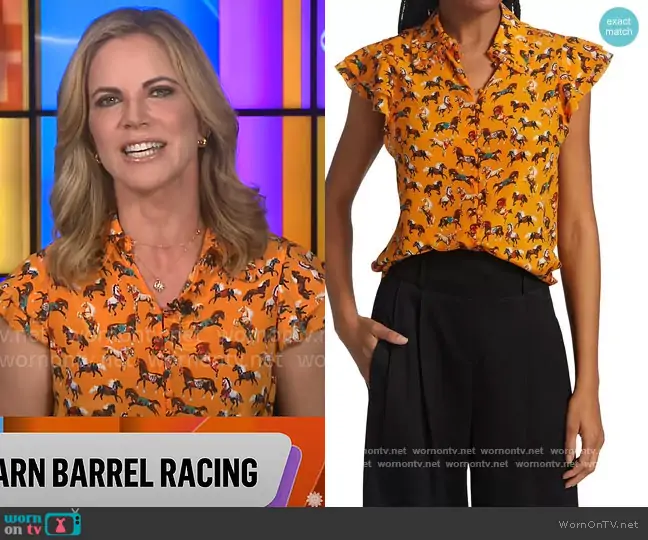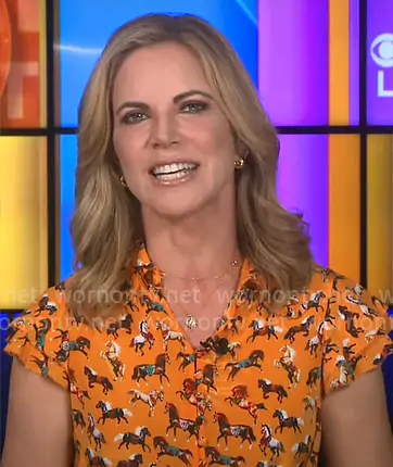 Natalie Morales on CBS Mornings on CBS was spotted wearing this orange horse print top on CBS Mornings on Sep 22 2025's episode. Natalie's Top is the Martell horse-print silk blouse by Alice+ Olivia .