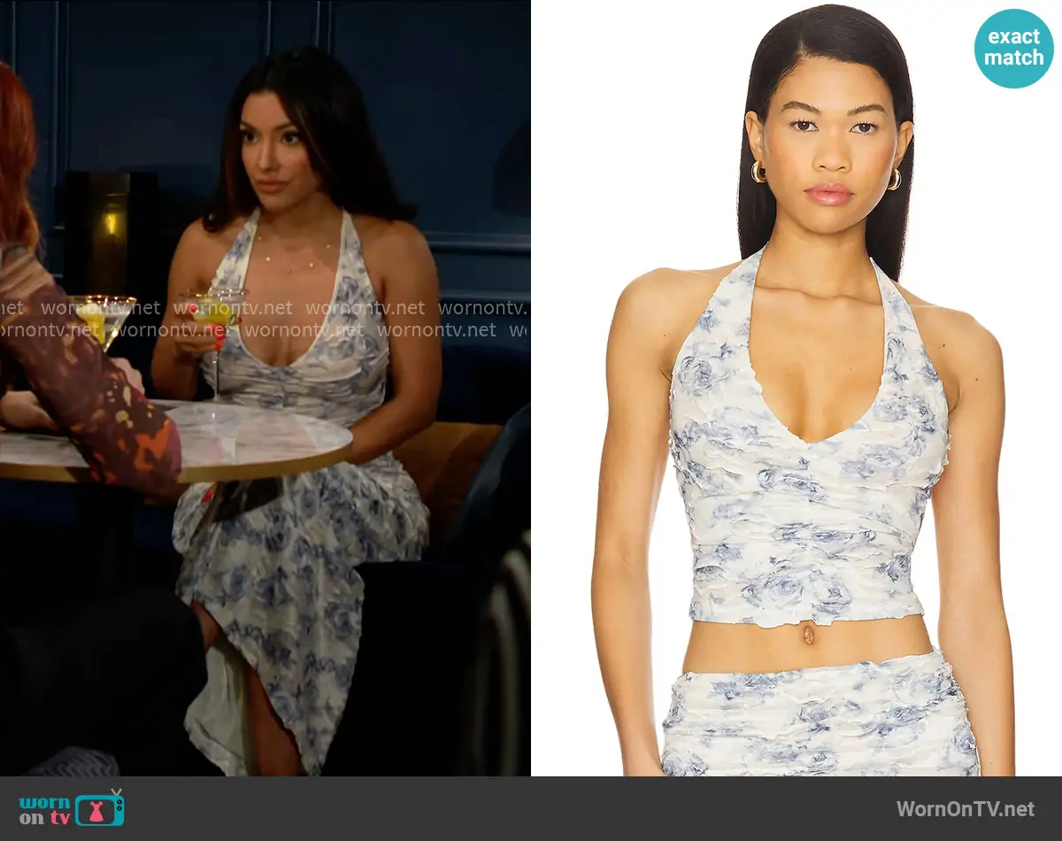 Audra Charles (played by Zuleyka Silver) on The Young and the Restless on CBS was spotted wearing this blue floral halter top and maxi skirt set on The Young and the Restless on Sep 22 2025's episode. Audra's Top is the Riva Halter Top in Porcelain Rose by Bec + Bridge . Audra's Skirt is the Riva Maxi Skirt in Porcelain Rose by Bec + Bridge.