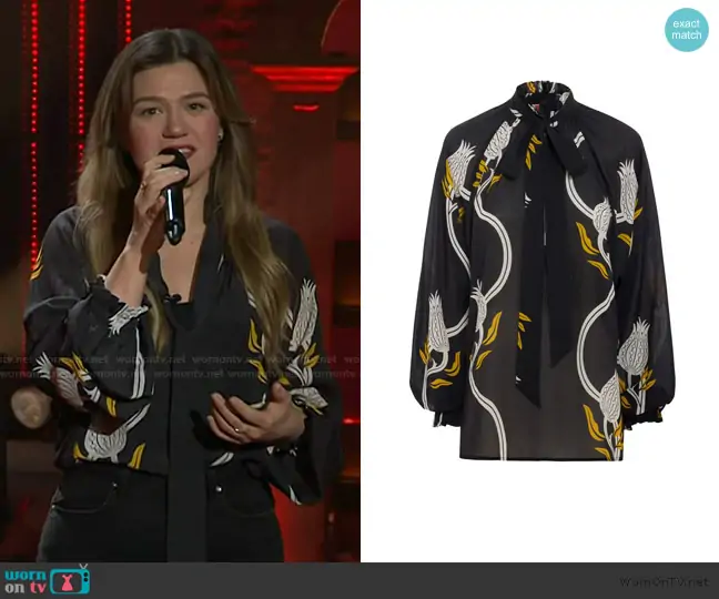 Kelly Clarkson on The Kelly Clarkson Show on NBC was spotted wearing this black printed blouse on The Kelly Clarkson Show on Sep 22 2025's episode. Kelly's Top is the Cerere blouse by LA DoubleJ.