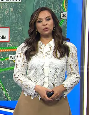 Adelle Caballero on Today on NBC was spotted wearing this white floral lace blouse on Today on Sep 23 2025's episode. Adelle's Top is the June Roja Lace Top in White by Milly.