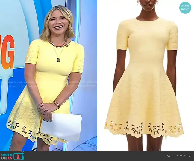 Jenna Bush Hager on Today on NBC was spotted wearing this yellow eyelet mini dress on Today on Sep 23 2025's episode. Jenna's Dress is the Jacquard Eyelet Fit-&Flare Dress by Oscar de la Renta.