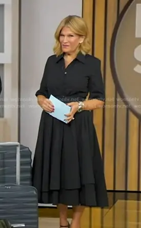 Tory Johnson on Good Morning America on ABC was spotted wearing this black layered short sleeve dress on Good Morning America on Dec 15 2025's episode. Tory's Dress is the Short-Sleeve Belted A-line Dress by Co.