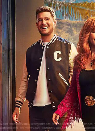 Michael Bublé on The Voice on NBC was spotted wearing this opening scene varsity jacket on The Voice on Sep 22 2025's episode. Michael's Jacket is the Classic Teddy Jacket in textured wool by Celine.