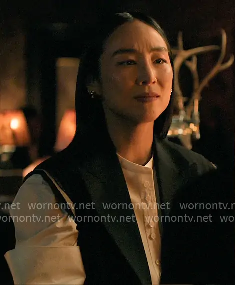 Stella Bak (played by Greta Lee) on The Morning Show on Apple TV was spotted wearing this vest on The Morning Show on episode 'The Revolution Will Be Televised' (4x02) in Sep 2025. Stella's Vest is the Canvas-trimmed grain de poudre and shell vest by Sacai.