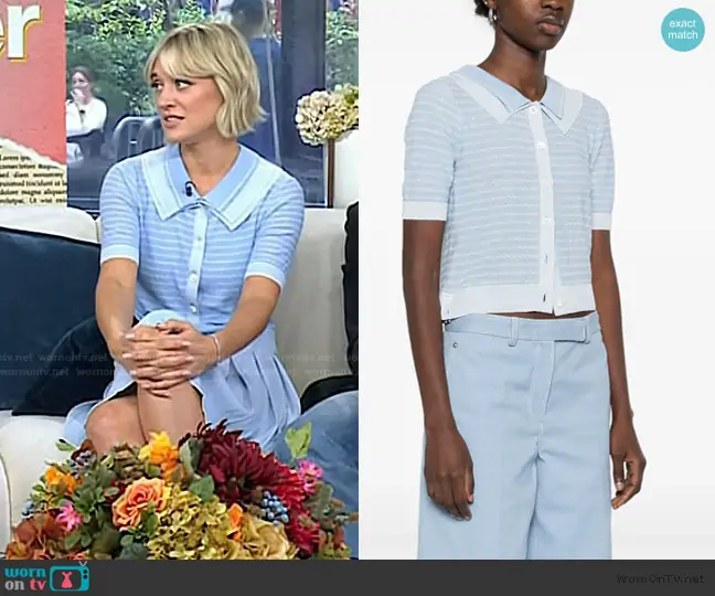 on Today on NBC was spotted wearing this blue striped polo on Today on Sep 24 2025's episode. 's Top is the Striped tuck-stitch cardigan by Thom Browne.