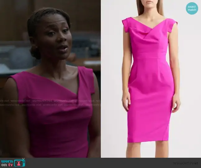 Jax Stewart (played by Emayatzy Corinealdi) on Reasonable Doubt on Hulu was spotted wearing this pink asymmetric neck dress on Reasonable Doubt on episode 'Run This Town' (3x03) in Sep 2025. Jax's Dress is the Jackie O Sheath Dress by Black Halo.