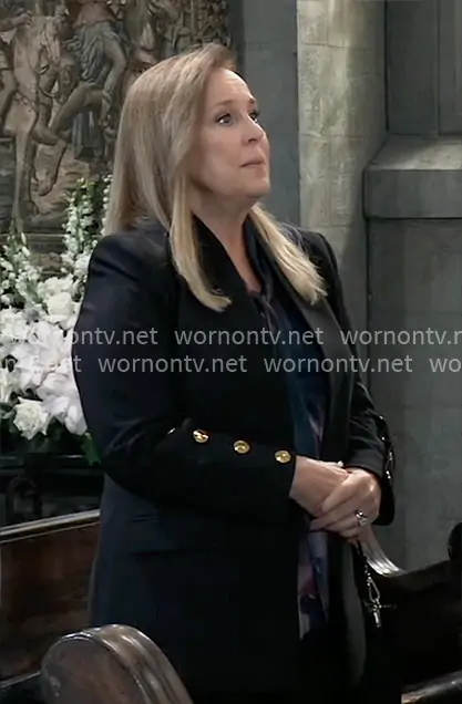 Laura Collins (played by Genie Francis) on General Hospital on ABC was spotted wearing this black blazer with buttoned sleeves on General Hospital on Sep 25 2025's episode. Laura's Top is the Tie Neck Crêpe de Chine Blouse by Misook . Laura's Jacket is the Sleeve Button Detail Shawl Collar Jacket by Donna Karan .
