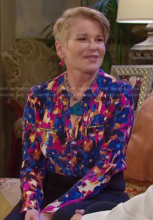 Bonnie Lockhart (played by Judi Evans) on Days of our Lives on Peacock was spotted wearing this abstract print blouse on Days of our Lives on Sep 26 2025's episode. Bonnie's Top is the Printed Zip-Pocket Long-Sleeve Top by I.N.C. International Concepts . Bonnie's Earrings is the Gemstone Pear Drop Earrings by Karen Kane.