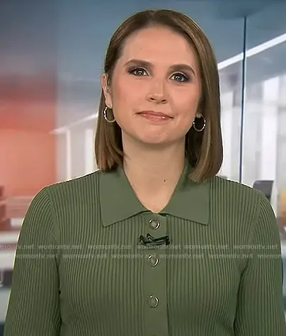 Elizabeth Schulze on Good Morning America on ABC was spotted wearing this green ribbed dress on Good Morning America on Feb 12 2026's episode. Elizabeth's Dress is the Lauper Ribbed Dress by Veronica Beard.