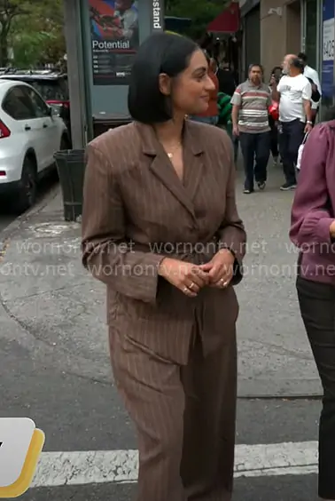 Shanelle Kaul on CBS Mornings on CBS was spotted wearing this brown pinstripe suit on CBS Mornings on Sep 28 2025's episode. Shanelle's Jacket is the Striped Shoulder Pad Blazer with Thin Belt by Zara . Shanelle's Pants is the Double Pleat Flap Pants by Zara .