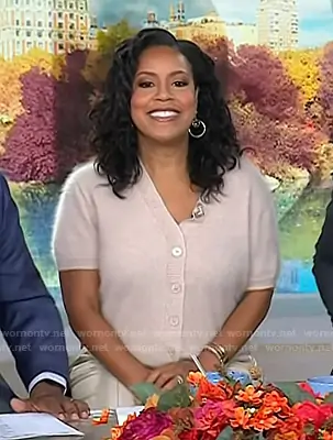 Sheinelle Jones on Today on NBC was spotted wearing this blush pink short sleeve cardigan on Today on Sep 29 2025's episode. Sheinelle's Sweater is the Brushed Cashmere Short-sleeve Cardigan in Hthr Flax by J. Crew.