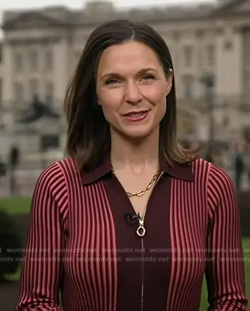 Maggie Rulli on Good Morning America on ABC was spotted wearing this pink striped dress on Good Morning America on Oct 10 2025's episode. Maggie's Dress is the Collared Maxi Dress in Rhubarb Pink/Bordeaux by Me + Em.