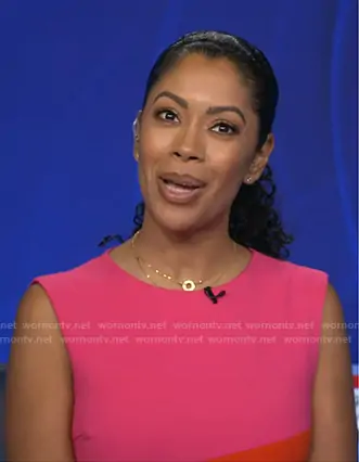 Shirleen Allicot on Good Morning America on ABC was spotted wearing this pink colorblock dress on Good Morning America on Sep 29 2025's episode. Shirleen's Dress is the Compact Stretch Color Block Tailored Pencil Dress in Hot Pink by Karen Millen.