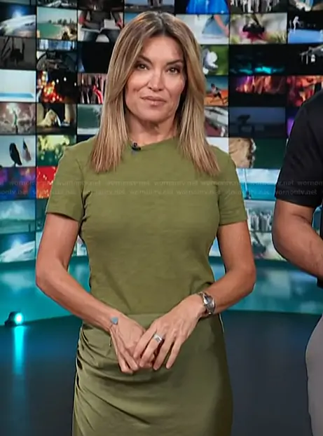 Kit Hoover on Access Hollywood on NBC was spotted wearing this green tee and satin skirt on Access Hollywood on Oct 20 2025's episode. Kit's Top is the 2 Nebulous Organic Cotton Tiny Tee by Theory . Kit's Skirt is the Ruched Midi Skirt in Crushed Satin by Theory.