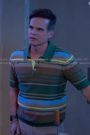 Leo Stark (played by Greg Rikaart) on Days of our Lives on Peacock was spotted wearing this green striped polo on Days of our Lives on Sep 29 2025's episode. Leo's Shirt is the Stripe Textured Cotton Knit Polo in Sage Green Multi Stripe by Scotch & Soda.